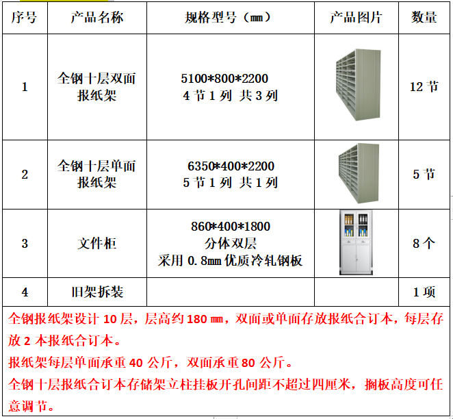 一、采购项目:合订本报架、货架等采购及安装采购项目