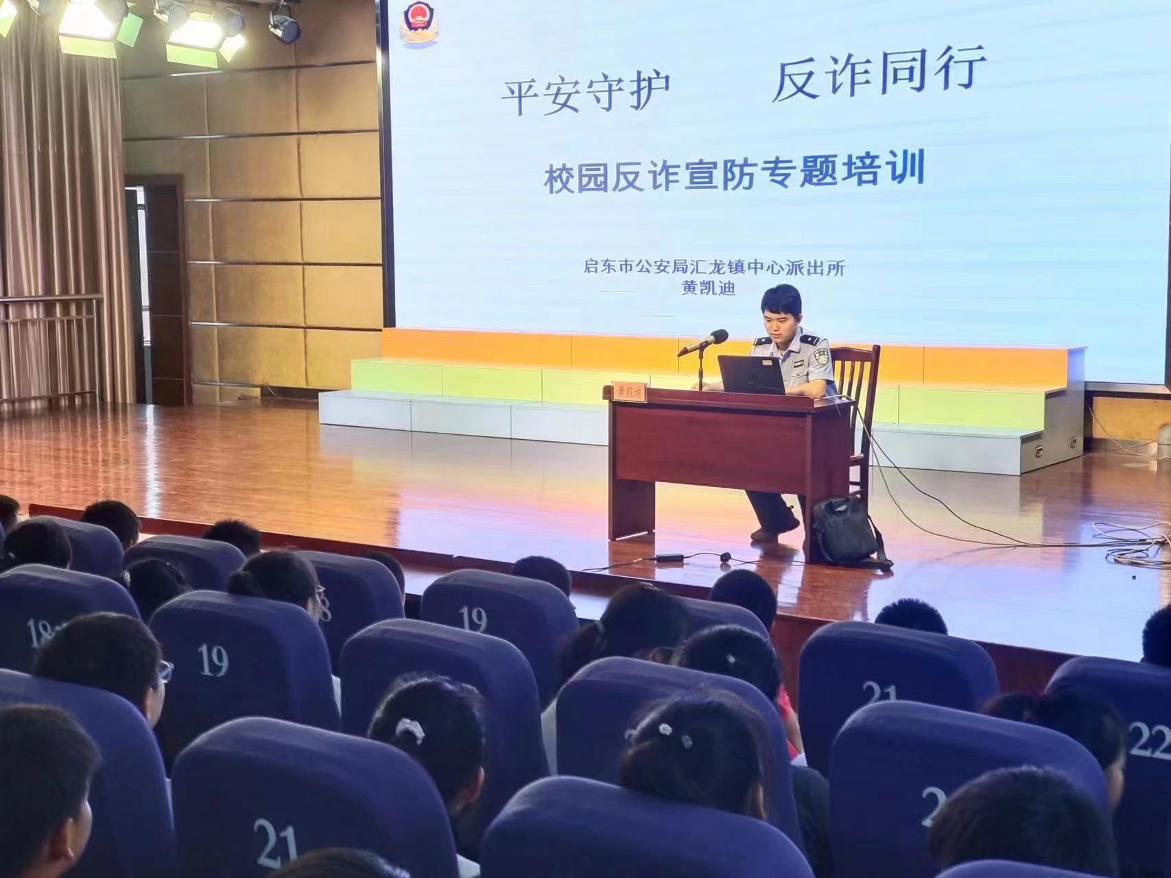 9月14日,启东市公安局汇龙镇中心派出所深入辖区汇龙小学,举办“平安守护、反诈同行“为主题的反诈宣讲会,400多名师生参加了会议。会上,民警结合大量真实案例,用通俗易懂的语言向师生们讲解了刷单返利、虚假投资理财、冒充电商物流客服、虚假贷款、虚假征信、虚假购物服务、冒充领导熟人、网络游戏产品虚假交易、冒充公检法、婚恋交友等十大高发电信诈骗类型的特点和手段,提醒师生们如遇可疑短信和电话,谨记“不听、不信、不转帐”的原则,日常生活中也不要轻易将个人资料、银行卡号、存款密码等信息告知他人。同时,民警还引导师生及时下载注册“国家反诈中心”APP,并将反诈知识传授给家人和亲朋好友,真正把电信网络诈骗阻挡在外。