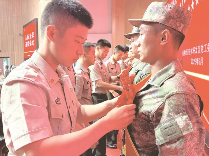 昨天上午,南通开发区2023年秋季新兵入伍欢送暨老兵返乡欢迎仪式举行,28名返乡退役士兵为34名即将入伍的新兵披绶戴花。老兵代表深情讲述自己的军旅经历,勉励新兵扎根军营、建功立业,赓续红色基因,让报国之志代代相传。 记者 司占伟摄