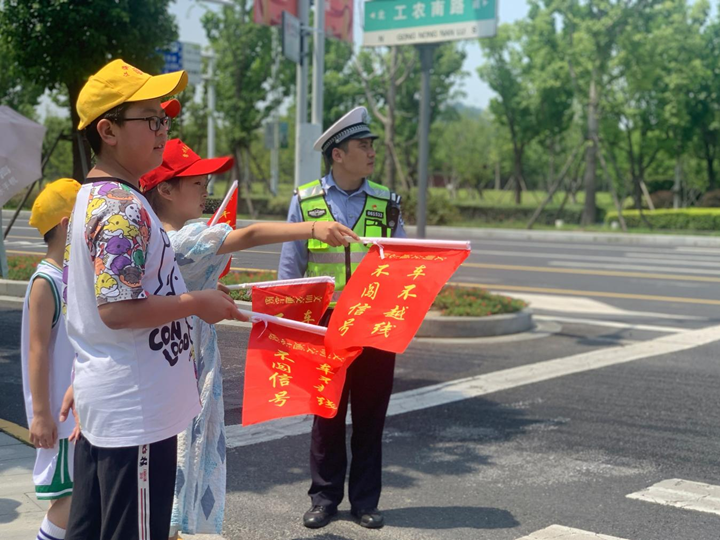 “不闯红灯、不翻越隔离栏,不在马路上玩耍打闹,乘车佩戴安全头盔。”在交通普法小课堂上,民警朱琳琳为孩子们讲述安全乘车、交通避险等知识。随后,同学们与交警叔叔一同上路“执勤”,对行人横穿马路、非机动车乱停乱放等不文明交通行为进行礼貌劝导,为助力文明交通贡献“微”力量。