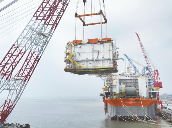 昨天,在启东中远海运海工码头,世界最大吨位、最大储油量新型海上浮式生产储卸油船顺利完成首批大型模块吊装。该新型海上浮式生产储卸油船设计日生产18万桶石油,可处理1200万标准立方米天然气,是名副其实的“海上移动炼油厂”,适用于全球各个海域的油气开发作业。 记者 许丛军摄