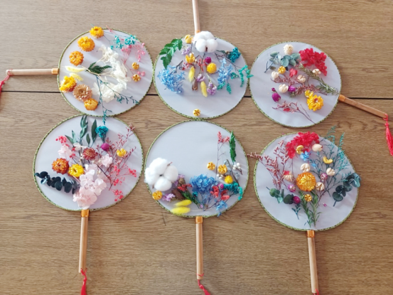 在志愿者的指导下,大家纷纷行动起来,着手制作独具一格的精美团扇,原本空空如也的团扇,瞬间花团锦簇,生机盎然,永生花与团扇的相遇妙不可言。