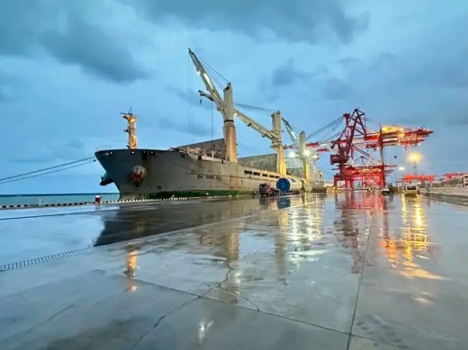 节后首日,通州湾吕四起步港区通洋码头上,桥吊起升抓取,往来拖车川流不息。在码头10号泊位,“大丹霞”号货轮正在进行装机作业,7套风电整机将从这里出口埃及。当天,通州湾吕四起步港区沪通公司也更加忙碌,各生产线持续抓质量、保安全、提效率,保障船舶顺利接卸。上午12时许,“恒隆109”轮靠泊沪通公司码头,至下午4时已完成180标箱接卸任务,当天夜班将完成“军正和谐”轮188个标箱装船作业。