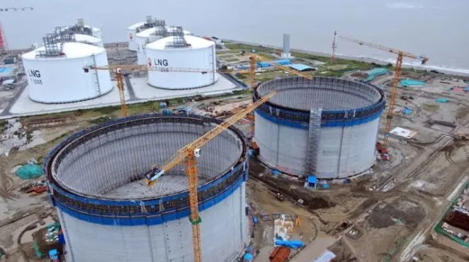 早上8点,如东洋口港阳光岛上一派繁忙景象。协鑫汇东LNG接收站项目现场,580多名工人正加班加点作业。目前,两座20万方的LNG储罐水泥浇筑已全部完成,预计本月中旬实现气顶升,春节前完成外罐施工。