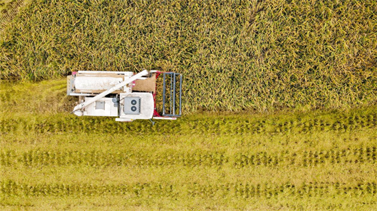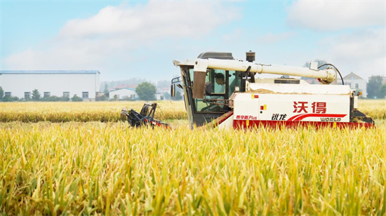 在一望无际的稻田里,金灿灿、沉甸甸的稻穗挂满了稻秆,空气中弥漫着稻谷的清香。一台台收割机在田间来回穿梭,随着轰隆隆的机械声响起,切割、脱粒等工序一气呵成,一派丰收的景象。