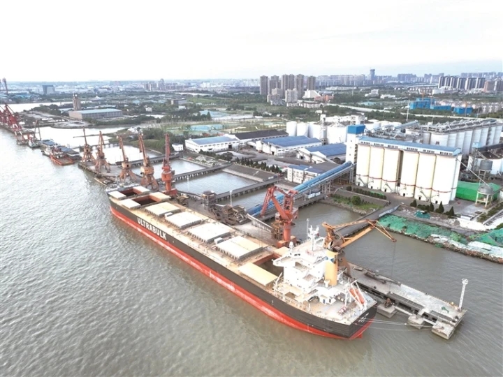 11日,南通粮油接运码头正在进行进口粮食卸运、转运作业,据介绍,南通口岸粮食进口来源地主要包括美国、巴西、加拿大等国家。记者 许丛军摄