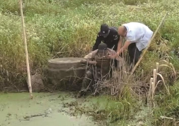 “河里的水冷,你快抓紧竹篙,我把你拉上来。”说话间,黄春飞伸出长竹篙。可神情异常的老人无动于衷。站在岸上的村干部和居民也纷纷劝导老人上来,然而,坐在水中的老人纹丝不动。时间刻不容缓,判断老人精神有问题的黄春飞将手机扔在岸边的草地上,然后跨入河中,向老人走去。由于河道长满水草,且淤泥很深,不住被陷进淤泥里、半个身子已被浸湿的他靠着竹篙的支撑,深一脚、浅一脚地接近了老人。通过观察,黄春飞发现老人坐在一根没入水中的钢管上。