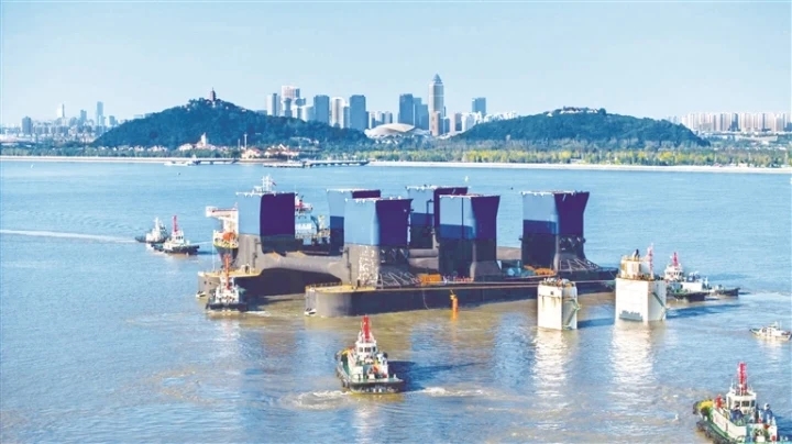 此次装载的平台底座由海庭(南通)重工有限公司承建,长120.48米,最大宽度91.16米,重1.7万吨,在长江段同类型产品中属最大。作为常年服务于“一带一路”倡议的半潜船,“华洋1”轮载重5万吨,最大下潜深度26.35米。