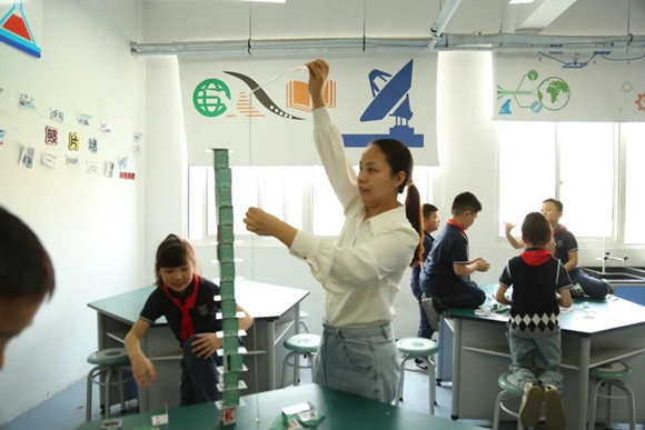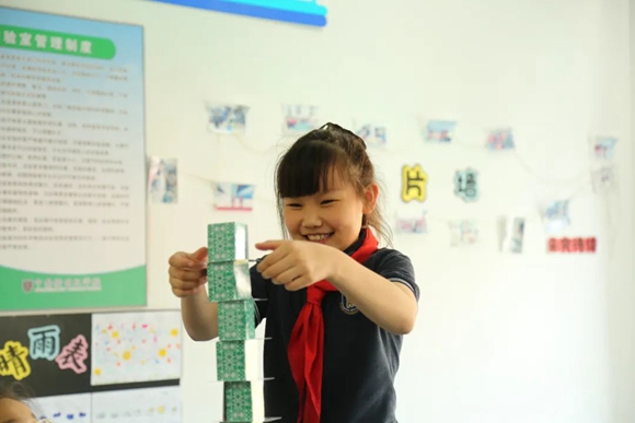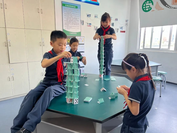 科学实验室, 三年级的小选手们全神贯注,目不转睛地看着自己搭建的“纸牌高楼”,用巧妙的方式轻轻地一张张向上叠加,小心谨慎地尝试“更上一层楼”。这不仅是技术和想象力的比拼,更是细心与耐心的较量。最终,三(1)班以98厘米的高度成功夺魁。