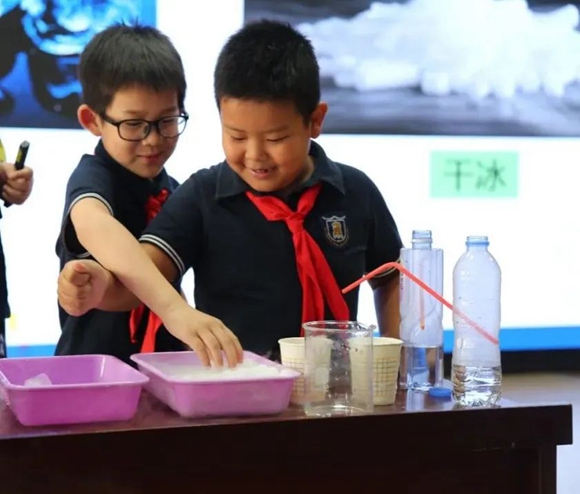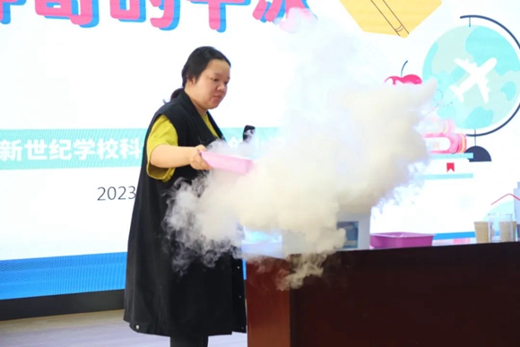 瞧,金蔷薇剧场烟雾缭绕,原来是季榆钰老师在进行干冰和水的碰撞实验与干冰泡泡实验,一二年级的小朋友们纷纷上台体验,感受干冰的神奇。陈琳老师带来了有趣的斐波那契数列,它就藏在音乐里、贝壳上、花瓣数中,生活中到处都有它的身影,真是神奇!