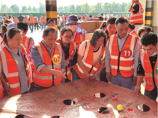 重走长征路上,哨声一响,选手们将“红军长征路线图”画布拉平,在地图上起点处放置一网球。网球有节奏地在画布上滚动,队员们聚精会神地盯着网球,在队长的指挥下,通过调整地图画布高低倾斜幅度,推动网球沿着红军长征路线缓缓前进。“慢一点,对对,往左边倾斜一点,太棒了,我们胜利了,安全到达“延安。”刚刚走完长征路的环卫工人尹锋开心地说,“太惊险了,差一点就掉下去,这个还是有技巧的,需要一定的配合才能走完。”