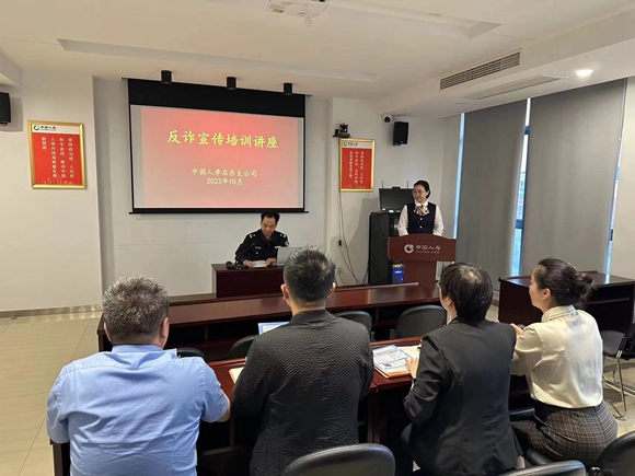10月25日,启东市公安局汇龙镇中心派出所深入辖区中国人寿保险股份有限公司启东支公司举办反诈宣传讲座。