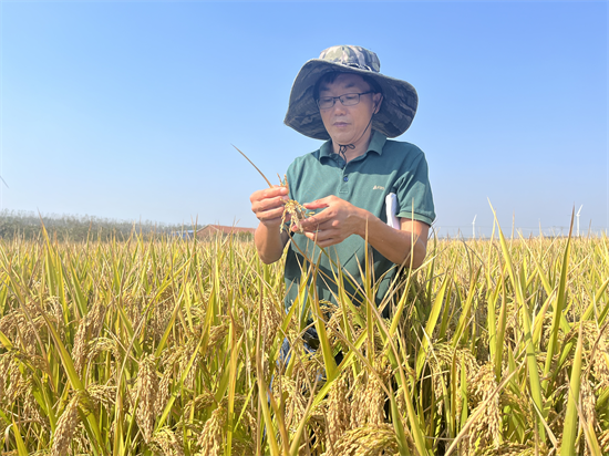 “今年我们选择了三个产量潜力高的杂粳品种,单个品种的种植规模都达到50亩。就当前测产的结果,亩产已经超越了常规品种。”如东县作物栽培站副站长於永杰告诉记者,与杂籼稻相比,杂粳稻综合产量潜力和稻米品质更具大面积试种价值,因此今年的7个耐盐水稻品种均选择了杂粳稻。根据杂粳的生育特性,技术团队将移栽株距缩短了2厘米,适当增加基本苗与前期肥料用量,全面采用机插缓混一次施肥技术,确保秧苗快速早发、壮苗,创造高产基础。