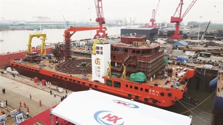 海新重工是海门高技术船舶海工装备制造的龙头企业,也是国内特种功能船舶制造的领军企业。近两年来,企业加快转型升级,积极进军新型海底电缆施工船领域。“国蛟一号”是中国首个国家海洋输电核心技术品牌,也是国家电网有限公司子品牌。此次打造的“启帆19号”船长108.6米,宽37.2米,设计吃水6米,排水量2.4万吨,跟一艘小型的航空母舰差不多。其单个转盘装缆量达10000吨,是我国排水量、海缆装载量最大的海缆作业船,有助于提升我国海洋输电装备和技术水平。
