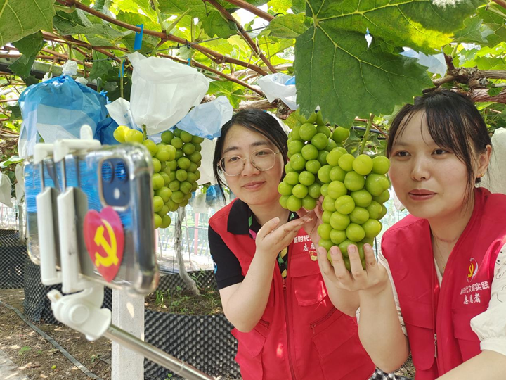 “今天直播间里的商品都是非常优惠的,种类齐全,‘家人们’点点关注啊!”“我们都是下单后现采现发的,保证新鲜。”在德康葡萄种植基地里,陈桥街道育爱村的年轻党员志愿者正友情客串直播间小姐姐,声情并茂地向网友推介当地特色葡萄,直播过程中,不断有客户下单。