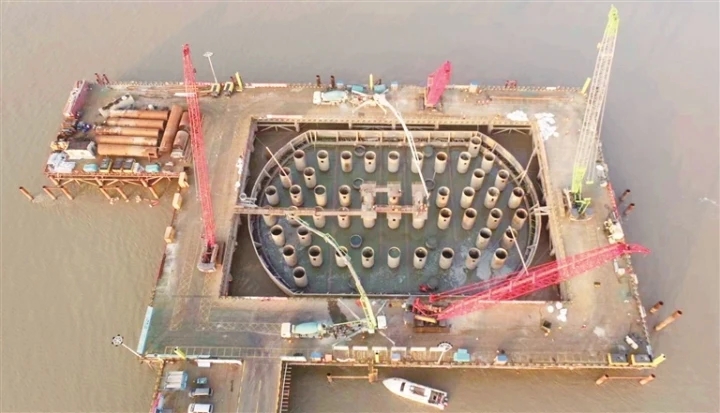 14日19时许,由中铁大桥局集团施工的沪渝蓉高铁崇启公铁长江大桥3号主墩围堰内水下混凝土首次封底完成(上图 通讯员 孟庆虎摄)。