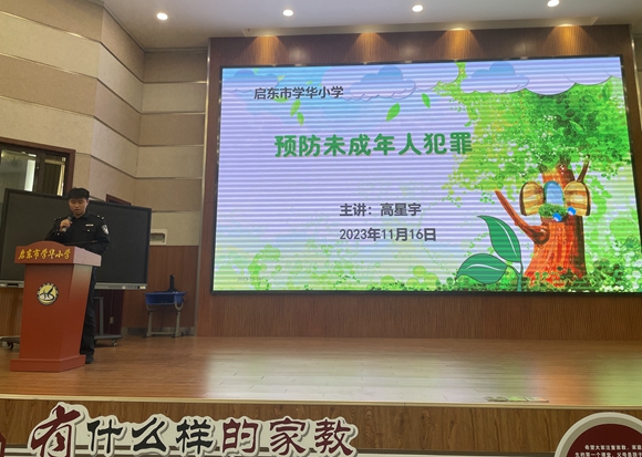 11月16日,启东市公安局汇龙镇中心派出所组织民警深入辖区学华小学举办预防未成年人犯罪讲座。