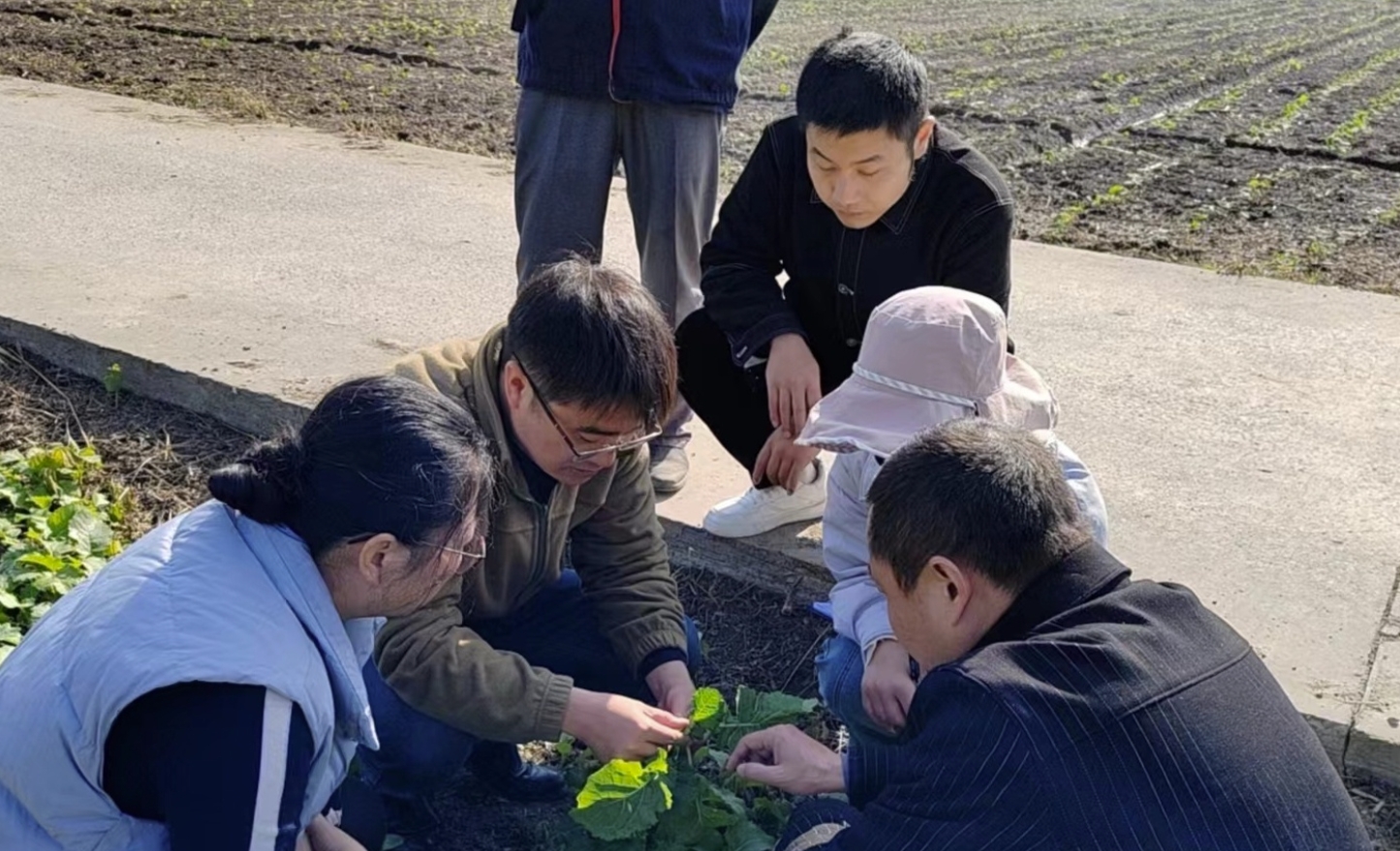 通州区作栽站站长吴永军(左二)带着“徒弟”在油菜、小麦田间现场指导。