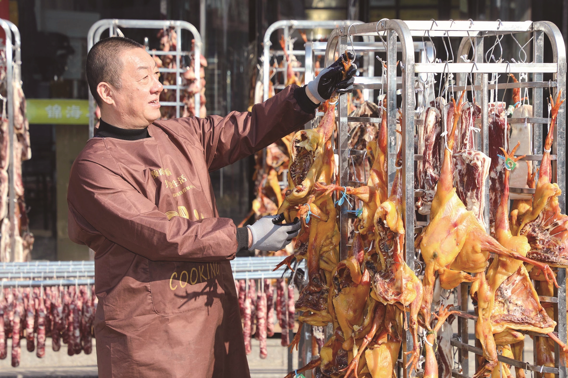 昨天,海安市海安镇人民东路一家酒店门前,工作人员正在晾晒腊味制品,香肠、咸肉、咸鱼、咸鸡在阳光照射下,显现出诱人的光泽。当前,气温下降、阳光充足,正是晒制传统腊味年货的好时机。 顾彬斌摄