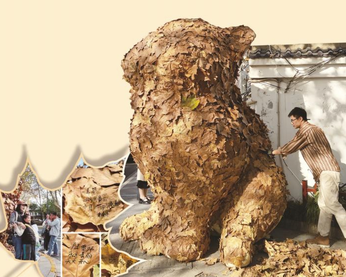 当落叶遇到街头艺术,你猜会发生什么?昨天,我市知名艺术博主葛多在南通博物苑南侧街角用飘落的梧桐叶精心创作了一只大大的“落叶猫”,吸引了众多市民前来打卡。 记者江建华