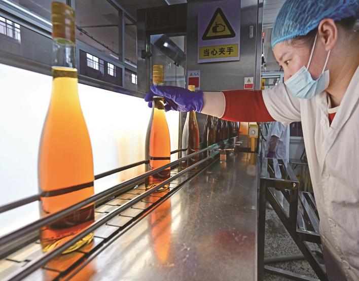 昨天,南通白蒲黄酒有限公司生产车间里工人在检查产品。白蒲黄酒历经三百多年传承发展,依旧“时光知味,历久弥香”。今年1—11月份,累计生产黄酒1.5万余吨,实现营收逾5000万元。 记者 丁传彬摄