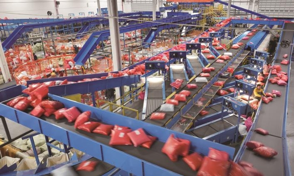 昨天,在深国际·叠石桥现代国际物流园韵达分拣中心,工作人员在分拣、转运销往全国各地的家纺产品。截至目前,今年海门区三星镇家纺产品线上线下成交额突破1400亿元,全年成交额有望突破1430亿元,创历史新高。 记者 许丛军摄