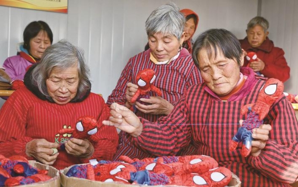 昨天,海安白甸镇周垛村“姐妹微家”内,当地妇女正在缝制“蜘蛛侠”玩具。近年来,海安白甸镇利用“姐妹微家”等阵地,通过技能培训,带动妇女灵活就业,增加经济收入。 周强摄