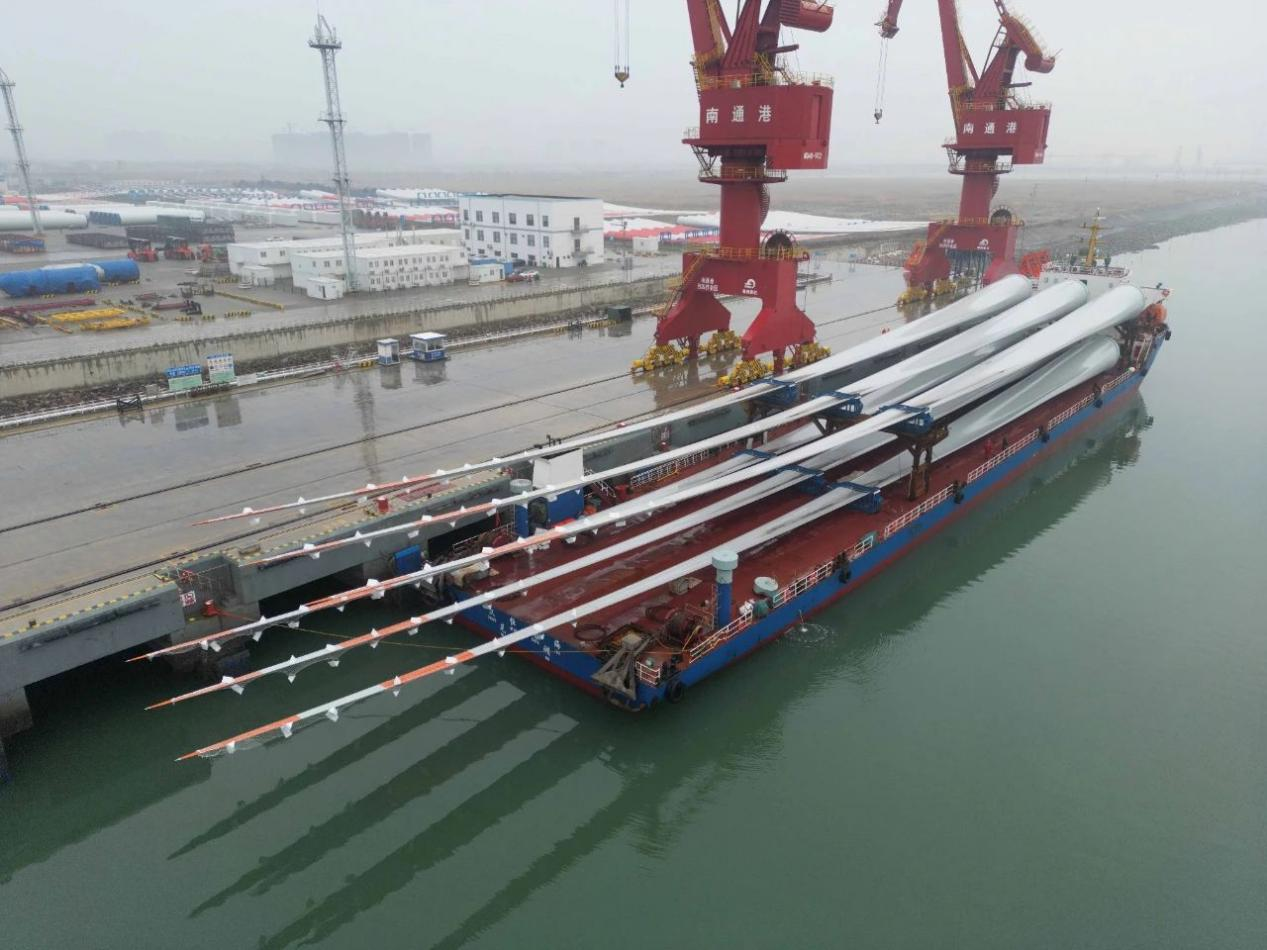 12月19日,装载111米超长风电叶片的“众恒山海”轮从通州湾吕四起步港区通用码头起航,刷新码头最长风叶吊装纪录。