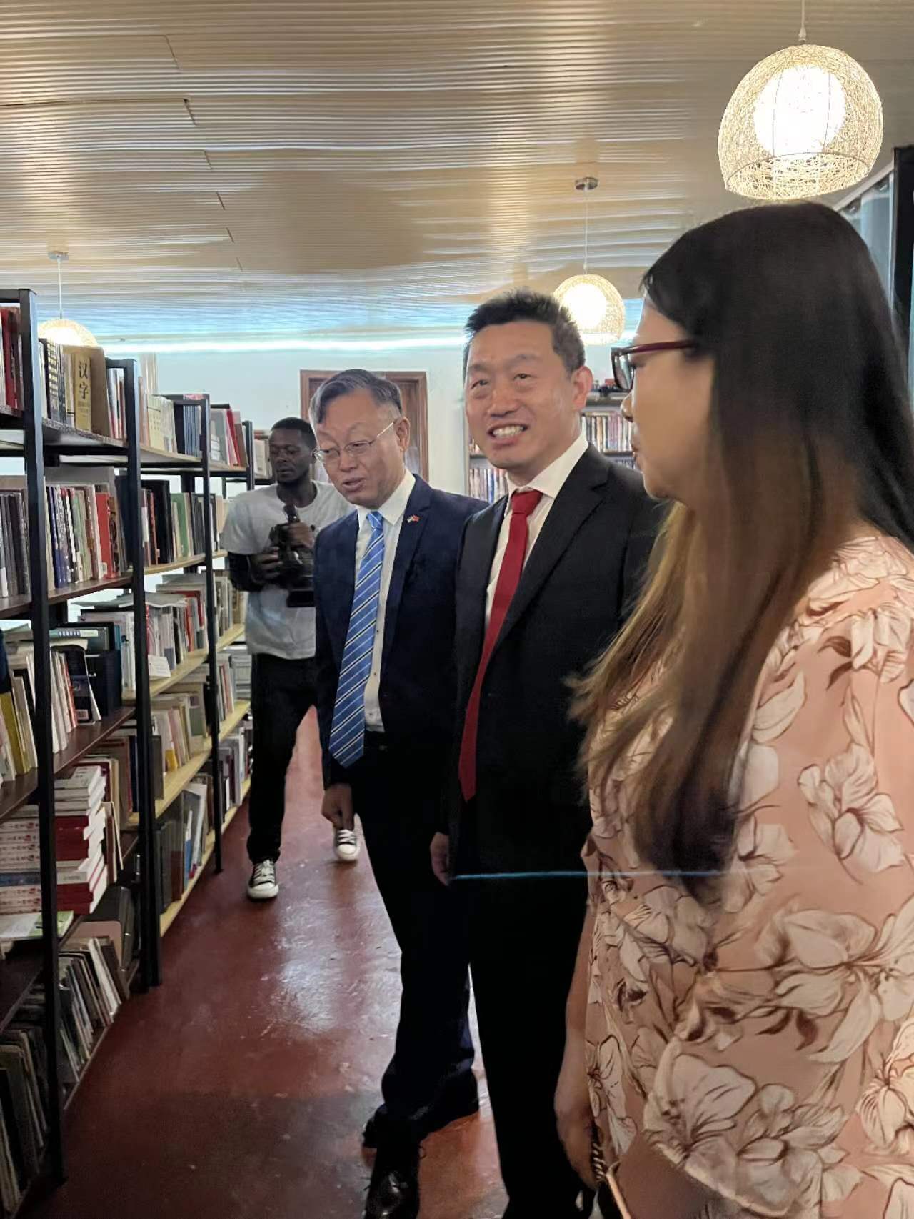 卢旺达首都基加利的一家咖啡馆,20米的书墙与帘幔外环绕的树墙呼应,普通民众和政商名流纷纷来漂流站打卡。侨领尹晴日印象深刻,驻卢旺达大使王雪坤来访时强调,“图书馆和其他公共外交不同,希望图书馆在中非文化交流中做出更多贡献”。