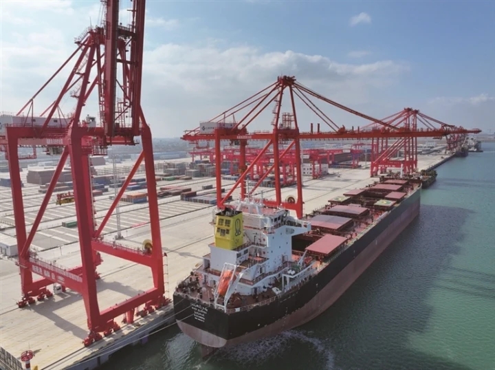 近日拍摄的启东吕四起步港区2+2码头。作为通州湾新出海口,吕四起步港区通用码头、集装箱码头开启“开港即繁忙”状态。2023年,仅通用码头就作业外贸船舶48艘次、内贸船舶55艘次,完成件杂货、散货合计201.5万立方米。 记者许丛军