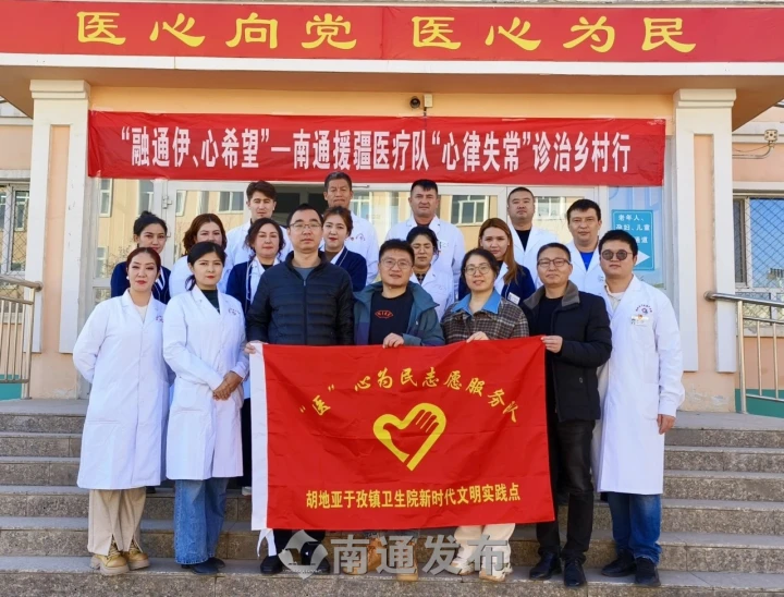 2023年11月29日,南通援疆医疗队专家、伊宁县人民医院副院长俞冲带领心血管内科赵东生博士、影像科副主任丁勇生、柔性援疆超声科专家蒋晓娟来到胡地亚于孜镇卫生院,开展心律失常筛查及义诊活动。本次活动是南通援疆医疗队开展“融通伊、心希望”心律失常诊治乡村行公益活动的第一站。赵东生博士入疆以来发现伊宁县心律失常的发病率高、知晓率低、医患的诊治理念相对落后。该类疾病完全可防可治,相当一部分可以通过消融手术彻底治愈,积极干预完全可以避免严重后果,大大减轻社会医疗卫生负担。为此,南通援疆医疗团队积极商量对策,决定联合伊宁县医共体开展“融通伊、心希望”心律失常诊治乡村行公益活动。他们从群众健康档案中筛选出1500多名心律失常患者,将义诊活动通知到各乡镇卫生院,并制定了此项活动计划表。2023年12月22日,赵东生博士在伊宁县曲鲁海乡卫生院义诊时,曲鲁海乡卫生院全体职工以载歌载舞方式表示感谢,那天恰逢赵博士生日,他激动地表示“一生难忘”。