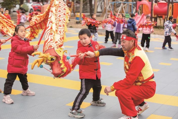 昨日,海安高新区海北幼儿园的孩子们在“丁家龙”传人的指导下学习舞龙。海北幼儿园深入推进“一校一品”建设,让孩子们在快乐运动中感受到中华民族传统文化的魅力。 翟慧勇 何海燕摄