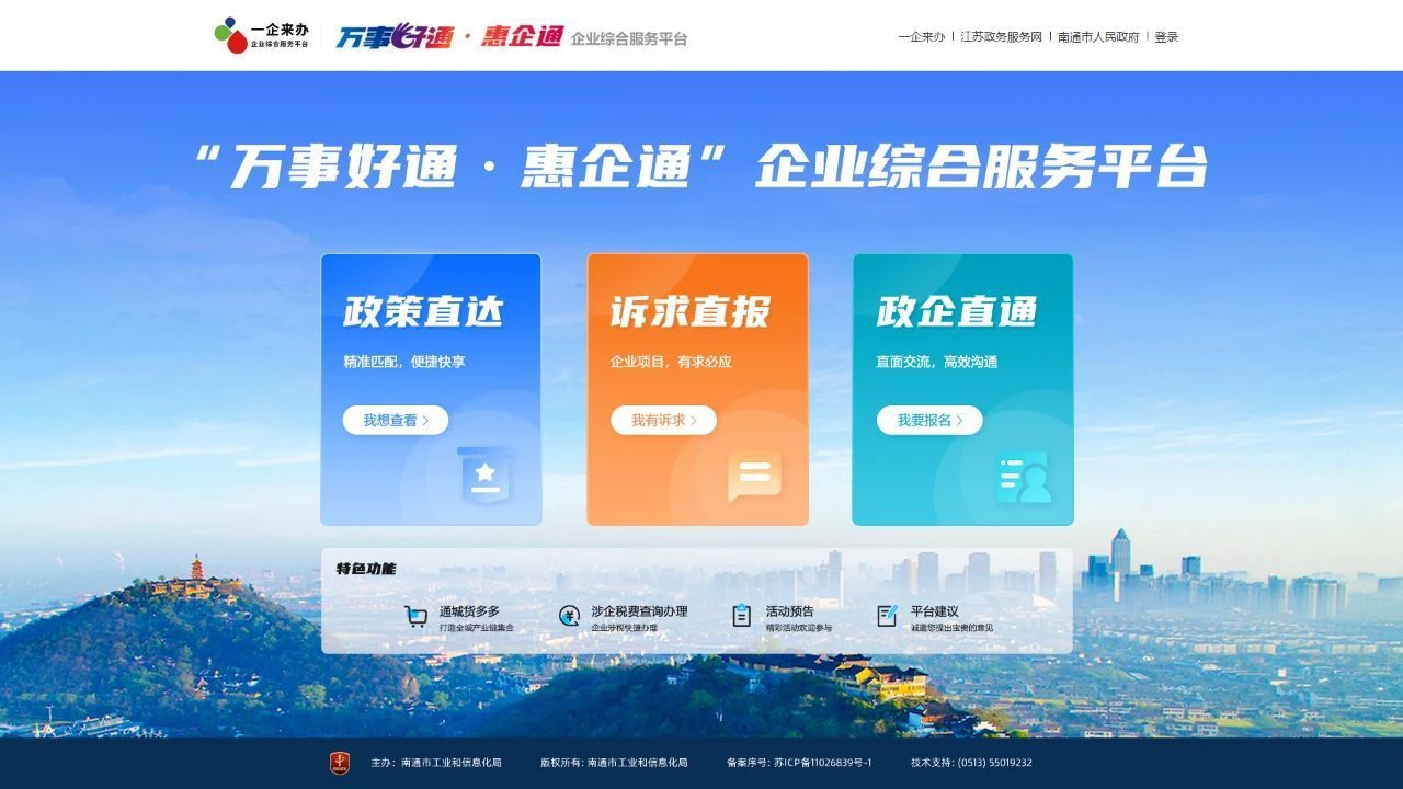 为全面落实《中共中央国务院关于促进民营经济发展壮大的意见》和国家、省市相关要求,进一步加大对企业家和就业群体的关心关怀,南通市委、市政府研究决定将多层级、多形式的政企对接细化落实到企业综合服务平台,已开通“我与市长(县长、区长)面对面”板块,拓展政企沟通交流,进一步提振企业发展信心,在助力企业做大做强、转型升级中给予全方位的支持;开通“政企直通座谈会”模块,定期组织不同主题的座谈交流、企业家沙龙等,营造“亲清”政商关系,为广大企业在通发展创造最好条件、提供最优服务。