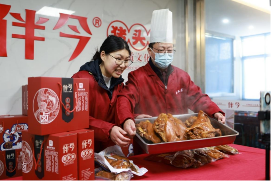 伴今猪头肉传承人陈来平说:“我们的直播账号刚刚开通,就引来很多老客关注,一场直播下来就有几千块钱的收入。今年开通线上渠道以后,商品格外畅销,预计要比往年提升30%的销售额,每天都有上百箱的商品销售到全国各地。”