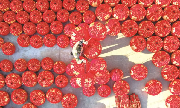 昨天,海安市墩头镇毛庄村一家灯笼作坊的工人正在加工、晾晒红灯笼。春节临近,吉祥喜庆的红灯笼日益走俏,海安市各灯笼生产企业及加工小作坊加紧制作各种款式的红灯笼,供应节日市场。 周强