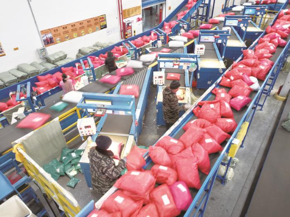 23日,在海门区三星镇深国际·叠石桥现代国际物流园,一快递企业分拣中心忙碌转运销往全国各地的家纺产品快件。春节前夕,叠石桥现代国际物流园快递、物流企业一片繁忙,日处理快件量比平时增加10%左右。 记者 许丛军摄