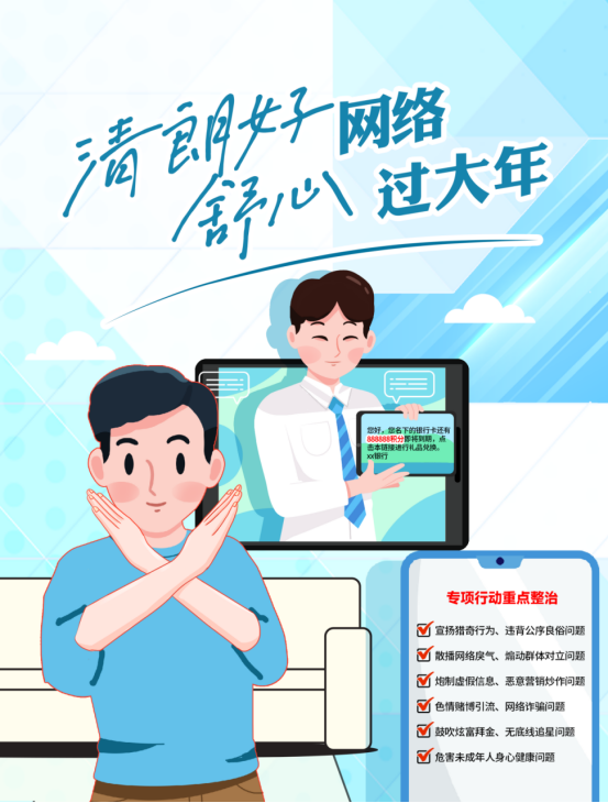 为营造喜庆祥和的春节网上氛围,中央网信办即日起开展为期1个月的“清朗·2024年春节网络环境整治”专项行动,聚焦春节期间网民常用的平台环节和服务类型,集中整治人民群众反映强烈的网络生态突出问题,切实净化网络环境。