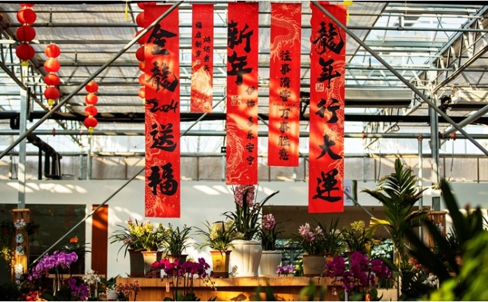 除了花卉的选择以外,花市也在年宵花的造型上下了功夫。水漾年华花市主管王凌告诉记者:“在花市现场购买的,我们花艺师可以根据顾客需求定制年宵花盆景。”花的颜色大多为朱红、云紫、明黄等喜庆明亮的颜色,还别出心裁地搭配含有过年元素的装饰品,在繁花中挂上“平安喜乐”“龙年大吉”等祝福小卡片、精致小巧的红灯笼等。