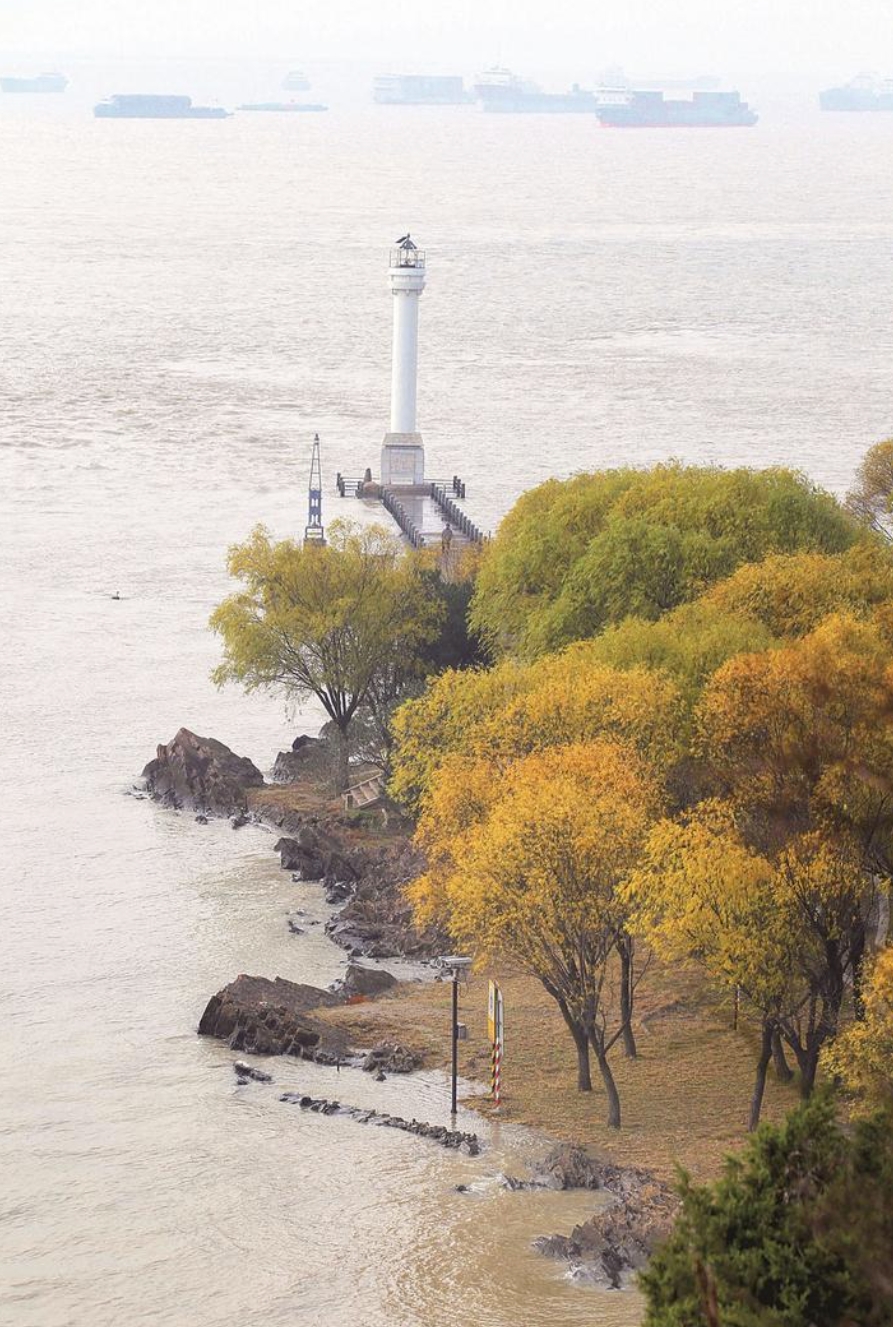 龙爪岩三面环水,在最前端的江水中,耸立着长江第一灯塔,为过往的船只指引方向。