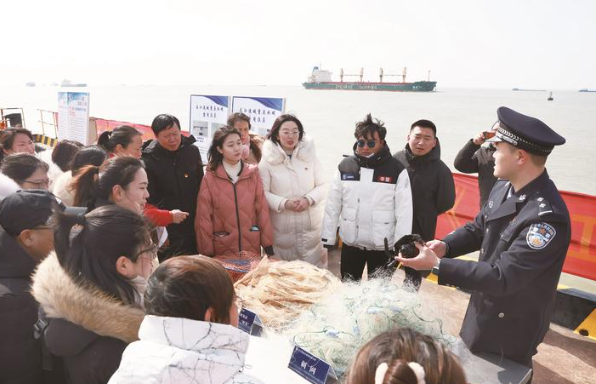 3月1日,“法韵长江美 绿泽江海地——《中华人民共和国长江保护法》实施三周年宣传暨沿江网格大支部生态护江共建活动在长江航运公安局南通分局警备码头举行,天生港镇街道辖区百余名干部群众齐聚长江边。活动通过上岸渔民变迁照片展、以案释法和禁捕渔具展示、水质检测、增殖放流和“沿江网格大支部护江联建”流动工作站成立等环节,展示长江大保护阶段性成果。 记者 许丛军摄