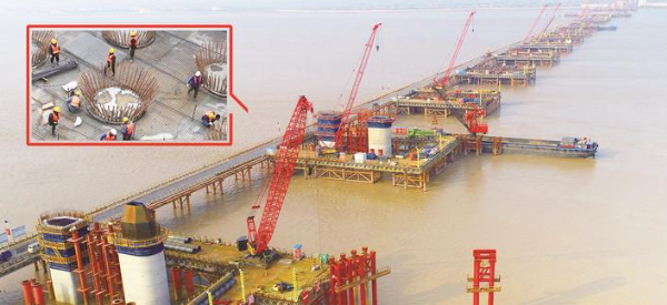 沪渝蓉高铁崇启公铁长江大桥3、4号两个主墩钢围堰封底施工完成之后,水上双主墩承台施工正稳步推进。图为10日,在3号主墩施工现场,工人们正进行承台钢筋绑扎,为3月底前进行第一层承台混凝土浇筑做准备。 彭军君文 孟庆虎摄