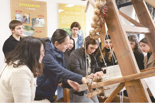 昨天,“文化崇川 游我所爱”中外文化交流活动暨南通大学国际学生中国文化体验基地揭牌仪式在南通蓝印花布博物馆举行。来自俄罗斯、巴基斯坦、印度尼西亚、卢旺达等国的学生现场体验蓝印花布、糖画、棕编、剪纸制作工艺,感受中国传统文化的魅力。 记者 许丛军摄