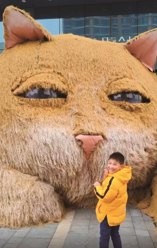 其实,这只独一无二的猫是葛多送给家乡人的春节礼物,前后历时两个月之久,至2月初制作完成。“我一直想尝试做件大型的作品,这只猫算是对我自己的一次挑战。”据他介绍,该猫身长20米,全身采用仿真草丝铺就,使用面积在250平方米左右;同时该材料还起到防水阻燃的作用,确保室外展陈的安全性。“当时选材料就花费了很久,考虑到广场上人流量较大、露天会遇雨水等因素,还是需要这种耐用安全的材料。”