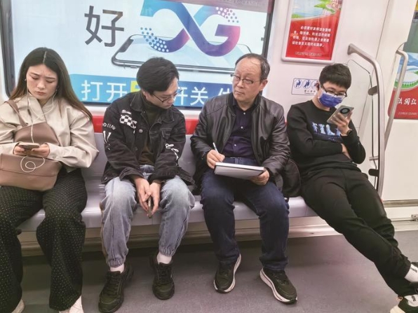 他手中厚厚的速写本,是一套“地铁时光”系列作品,画中的主角全是地铁上偶遇的乘客:有匆忙赶路的上班族,有甜蜜相依的情侣,也有背着书包的孩童……“家里还有几大本画满的,希望将来能办一个主题画展。”他笑着说。