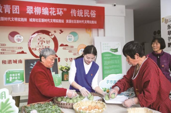 昨天,如皋市如城街道金鼎名城“你好·邻居”活动中心内,社区党员与居民一起制作青团,体验清明习俗。
