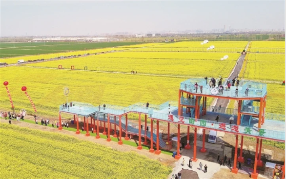 启动仪式上,热闹非凡,人头攒动,汉风舞蹈、汉服走秀等古风表演精彩纷呈,引得掌声不断。油菜花田里,除了传统金黄灿烂的油菜花外,温柔粉、西瓜红、热烈橙、清新黄……彩色的油菜花与一旁的风车、稻草人等景观小品相映成趣,让市民游客宛如置身现实版“莫奈的花园”。游客或三五成群驻足观赏、或举起手机拍照打卡、或登上高台遍览金浪滔滔的花海(右图,李波摄)。还有的游客在菜花集市品尝、购买各种春鲜美味、网红小吃、特色饮品,享受着春天的味道。