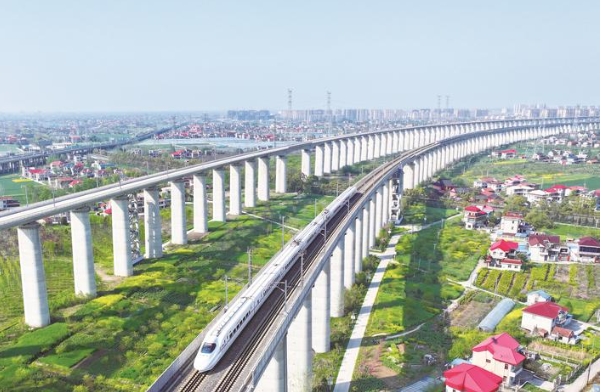 10日在通州区境内拍摄的沪苏通铁路线路上的动车组。为适应客货运输市场需求变化,长三角铁路4月11日起将实施第二季度列车运行图。 记者 许丛军摄