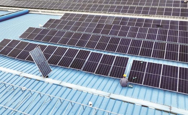 11日,工人在海安市孙庄街道海南村一企业的厂房屋顶安装太阳能光伏发电板。近年来,海安市坚持绿色发展理念,引导企业利用厂房闲置屋顶建设分布式光伏发电站,采用“自发自用、余电上网”模式,助力绿色低碳发展和乡村振兴。 顾华夏摄