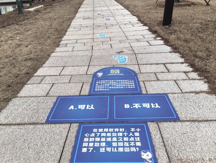 在龙游湾沿江生态景观带内湖畔,150米长的石板路成为市民群众新的打卡地。这里不仅有闯关小游戏,还有网友熟悉的童年游戏“跳房子”。深浅不一的“脚丫”上印着一道道常见常用的办公室网络安全、个人信息防护技能等问答题,沿着脚丫前行可以解锁网络安全相关技能。为筑牢全民网络安全防火墙,长江镇锁定客流量大的龙游湾,积极探索生动有趣的科普方式,将网络安全知识与小游戏相结合,打造网络安全趣味闯关步道,让群众沉浸式解锁网安技能。
