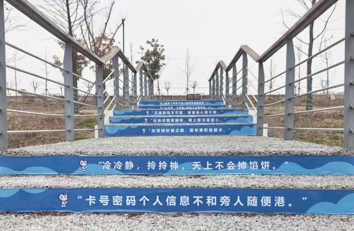 “认不得的链接不要信了意(随意)地点啊”“小投资,大回报,你我千万别搭歇(搭理)”“卡号密码个人信息不和旁人随便港(讲)”……沿着内湖景观台拾级而上,一条条方言版温馨提示映入眼帘。